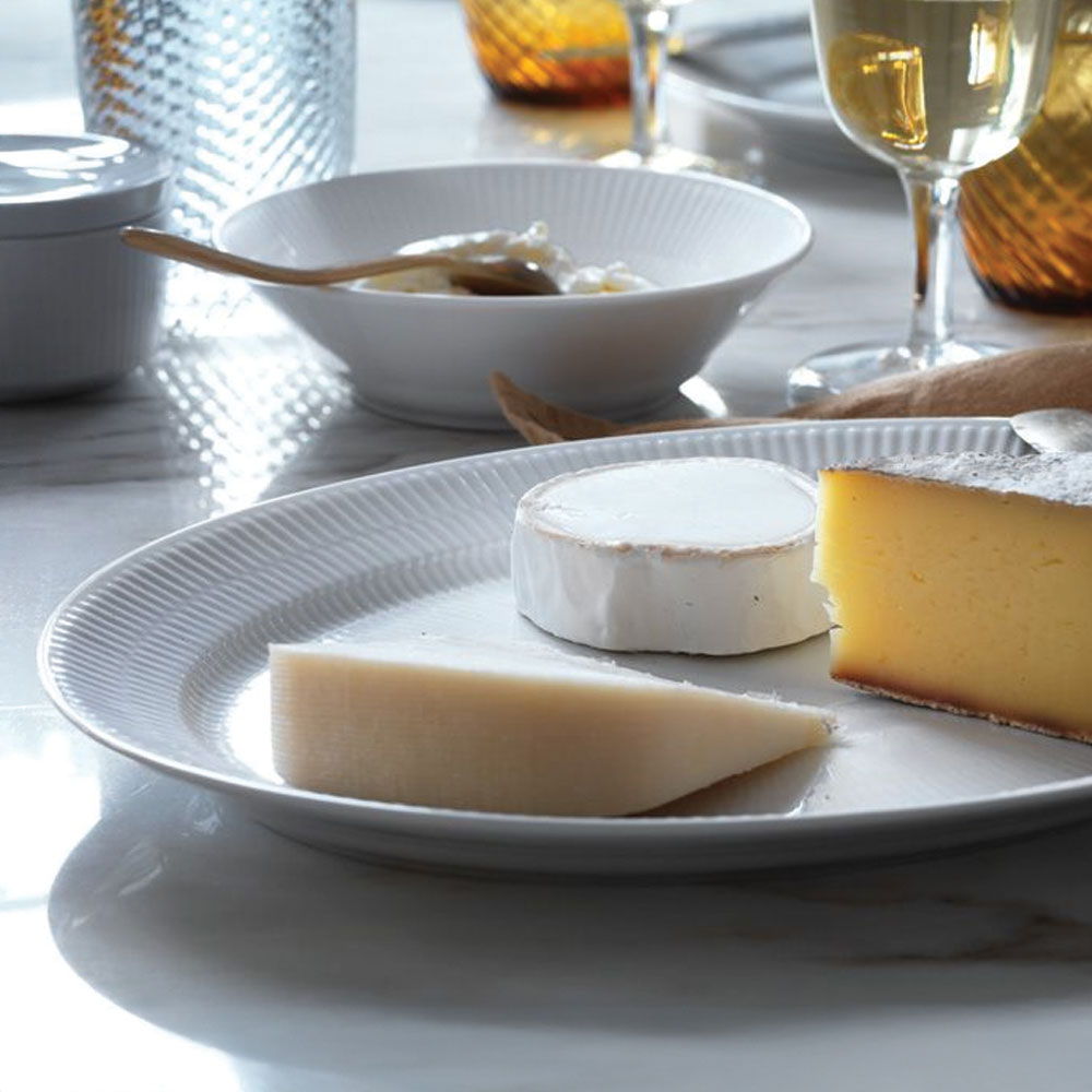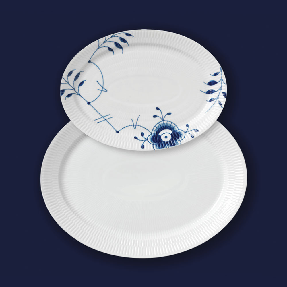 Gift with History-sættet består af to ovale fade, der elegant kombinerer det håndmalede Blå Mega Riflet med det enkle Hvid Riflet.